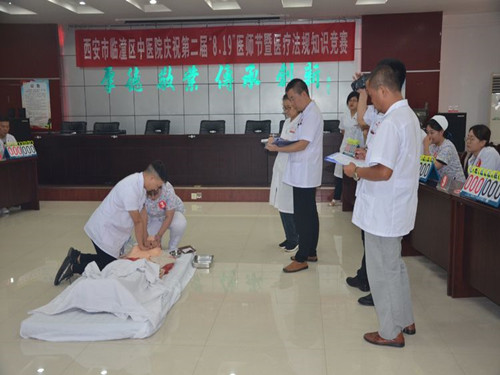 首先,副院长宣读了《庆祝临潼区中医院第二届8.19医师节暨法律法规知识竞赛活动的通知》。随后,参赛的12组选手按照赛前随机抽签的方式,开始心肺复苏演练,两人一组,密切配合,各评委老师坐镇现场,以专业的视角进行现场打分,场面紧张刺激。专业的比拼过后,万众期待的法律法规知识竞赛如期上演,简答、抢答等环节设置,让活动现场高潮迭起。