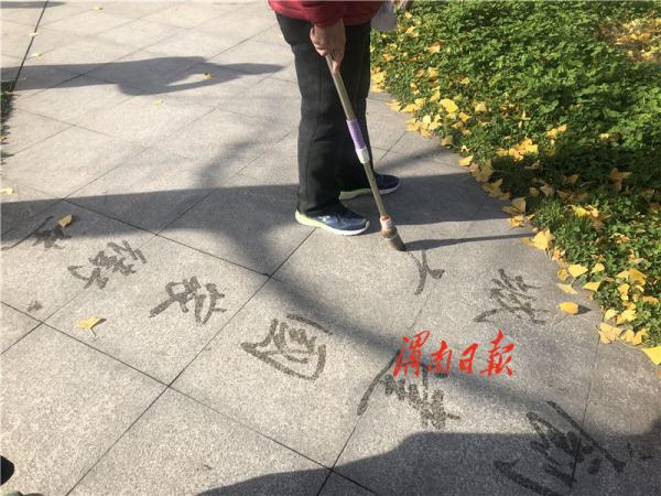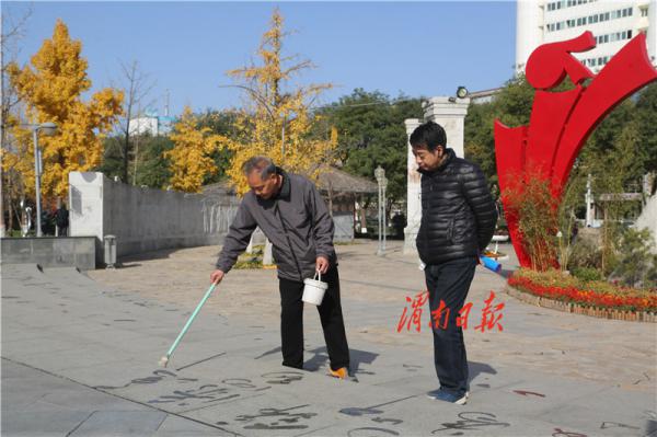 “创建国家卫生城市,美化我们共同家园。”两行大字映入眼帘。记者走近看到,这位书法爱好者正通过手上的毛笔传递着对创文创卫活动的支持。书法爱好者陆先生向我们介绍道:“自退休后,我每天早晨在朝阳公园写地书,我感觉近几年渭南的林地、草坪、蓝天、空气质量和市民素质都有着很大的进步。我想通过在地上写文明标语的方式,为渭南创文创卫做出一点贡献,我也希望每位市民都参与进来,共同创建文明、卫生、绿色、平安的城市。”